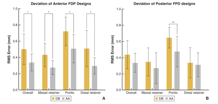 Atomica AI demonstrated significantly lower root mean square deviation than Dentbird in anterior FDPs