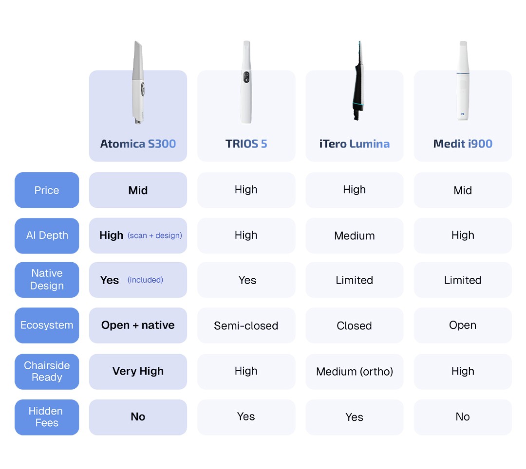 Compare accuracy, software, total cost, support, and long-term value across top U.S. scanners — including Atomica S300.